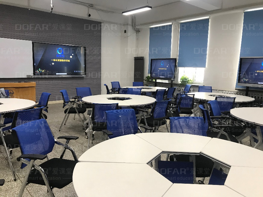 室分為手機(jī)互動教室、多視窗互動教室、多屏研討互動教室、網(wǎng)絡(luò)互動教室、靈活多變研討教室。所有教室中均使用了DOFAR愛課堂智慧教學(xué)系統(tǒng)。